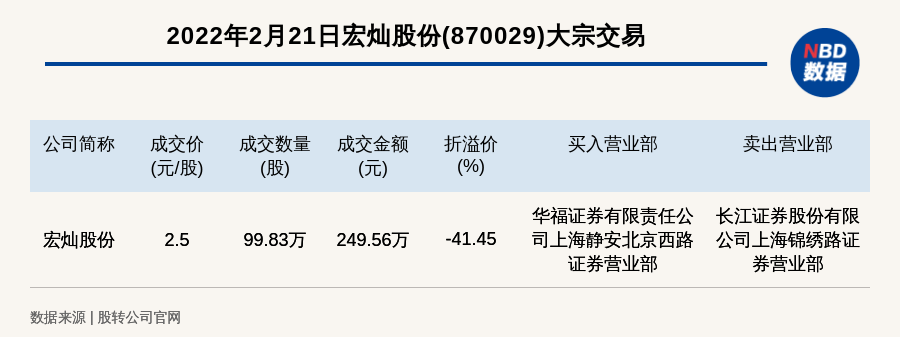 每经讯,2022年2月21日,新三板基础层公司宏灿股份(870029)发生一笔大宗交易,成交价2.5元/股,成交数量99.83万股,成交金额249.56万元,折价41.45%。买入营业部是华福证券有限责任公司上海静安北京西路证券营业部,卖出营业部是长江证券股份有限公司上海锦绣路证券营业部。