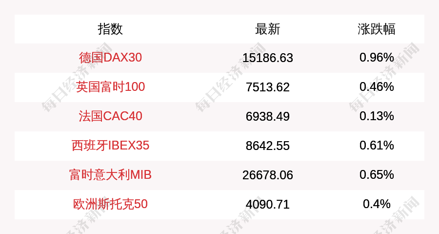 每经AI快讯:北京时间2月21日16:00,德国DAX30指数开盘上涨144.12点,涨幅为0.96%,报15186.63点;英国富时100指数开盘上涨34.84点,涨幅为0.46%,报7548.46点;法国CAC40指数开盘上涨8.86点,涨幅为0.13%,报6938.49点;西班牙IBEX35指数开盘上涨52.55点,涨幅为0.61%,报8642.55点;富时意大利MIB指数开盘上涨171.27点,涨幅为0.65%,报26678.06点;欧洲斯托克50指数开盘上涨16.43点,涨幅为0.4%,报4090.71点。