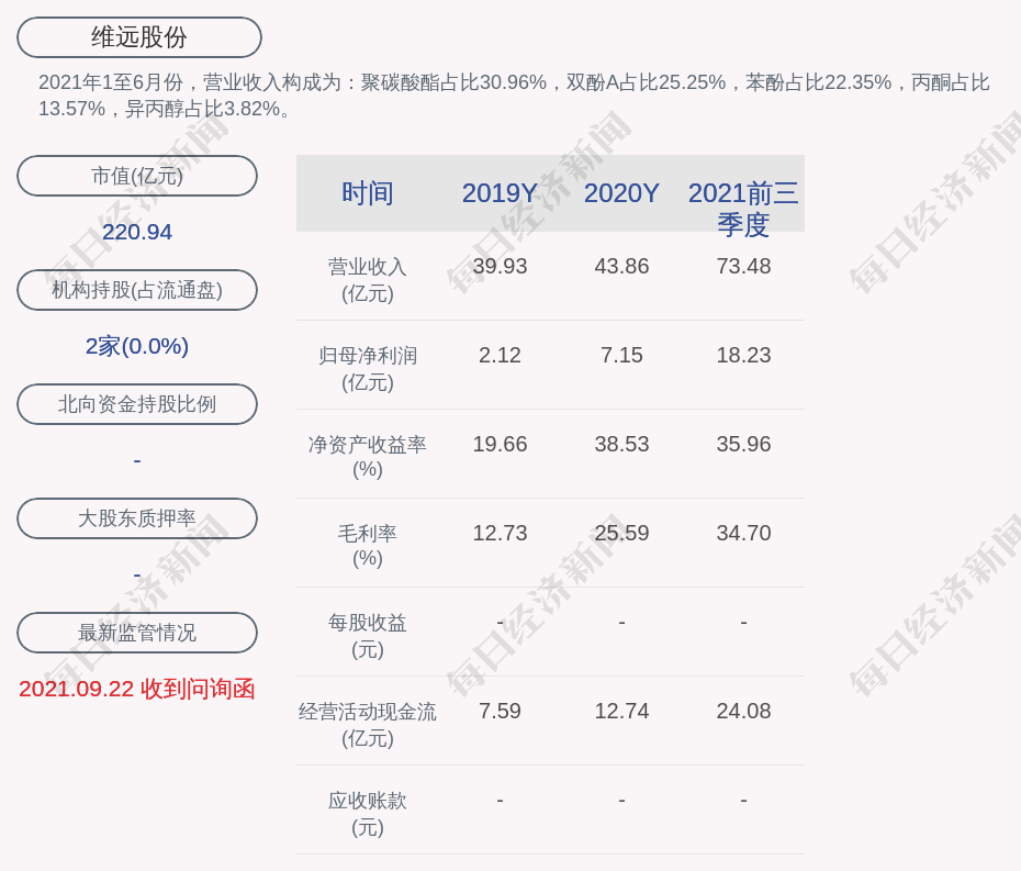 2021年1至6月份,维远股份的营业收入构成为:聚碳酸酯占比30.96%,双酚A占比25.25%,苯酚占比22.35%,丙酮占比13.57%,异丙醇占比3.82%。