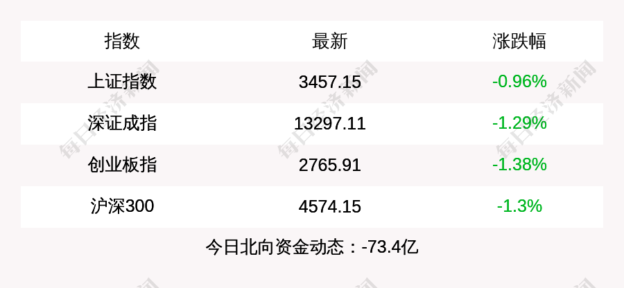 每经AI快讯:北京时间2月22日15:00,上证指数收盘下跌33.46点,跌幅为0.96%,报收3457.15点,成交额3876.79亿元;深证成指收盘下跌174.05点,跌幅为1.29%,报收13297.11点,成交额5905.96亿元;创业板指收盘下跌38.69点,跌幅为1.38%,报收2765.91点,成交额2350.65亿元;沪深300收盘下跌60.16点,跌幅为1.3%,报收4574.15点,成交额2468.73亿元。北上资金当日净流出73.4亿元。