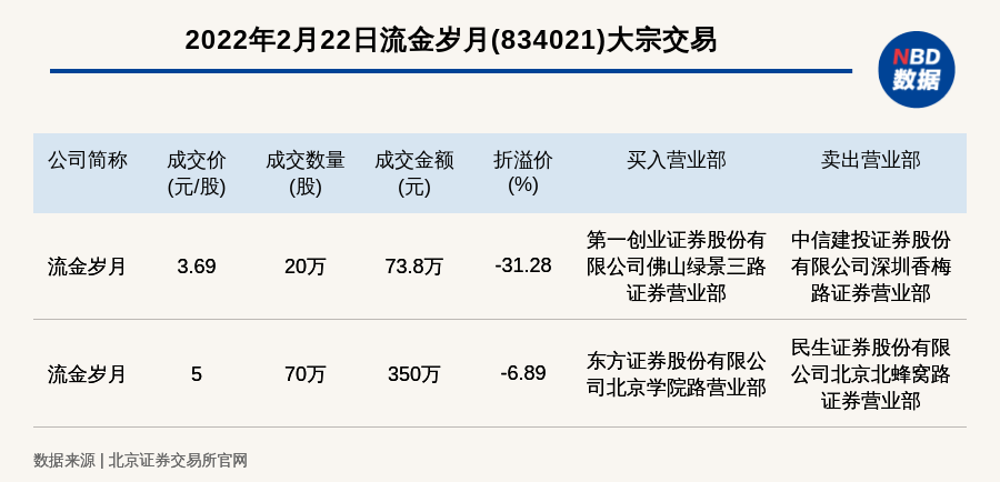 每经讯,2022年2月22日,北交所上市公司流金岁月(834021)发生2笔大宗交易,折价率最高的一笔成交价3.69元/股,成交数量20万股,成交金额73.8万元,折价31.28%。买入营业部是第一创业证券股份有限公司佛山绿景三路证券营业部,卖出营业部是中信建投证券股份有限公司深圳香梅路证券营业部。