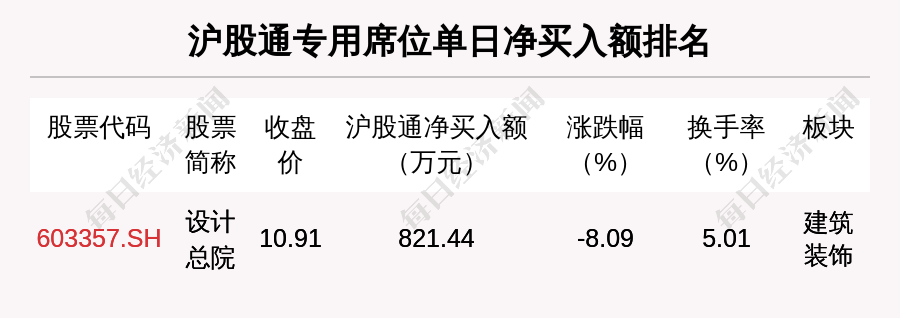 在龙虎榜中,涉及沪股通专用席位的个股有1只,设计总院的沪股通专用席位净买入额最大,净买入821.44万元。