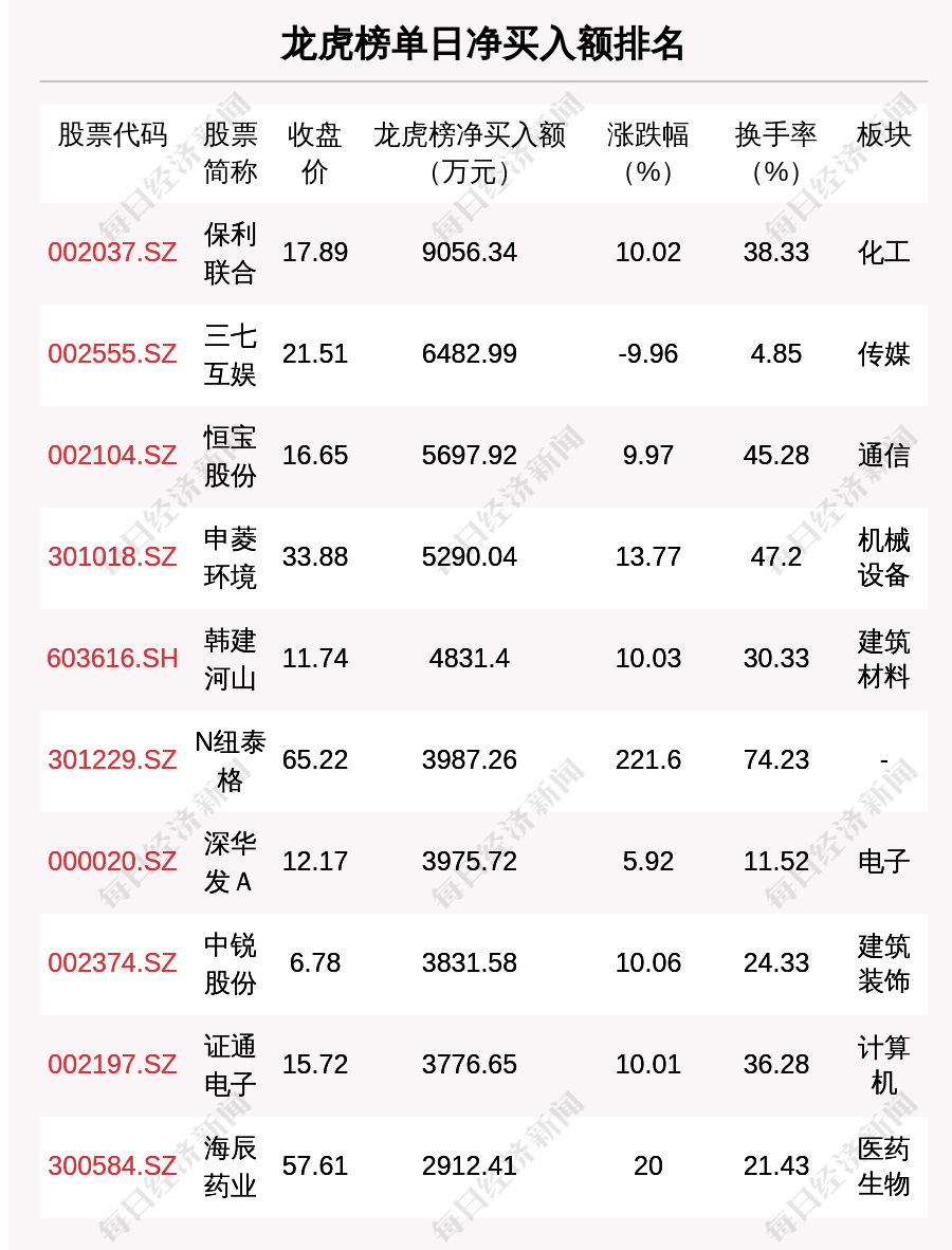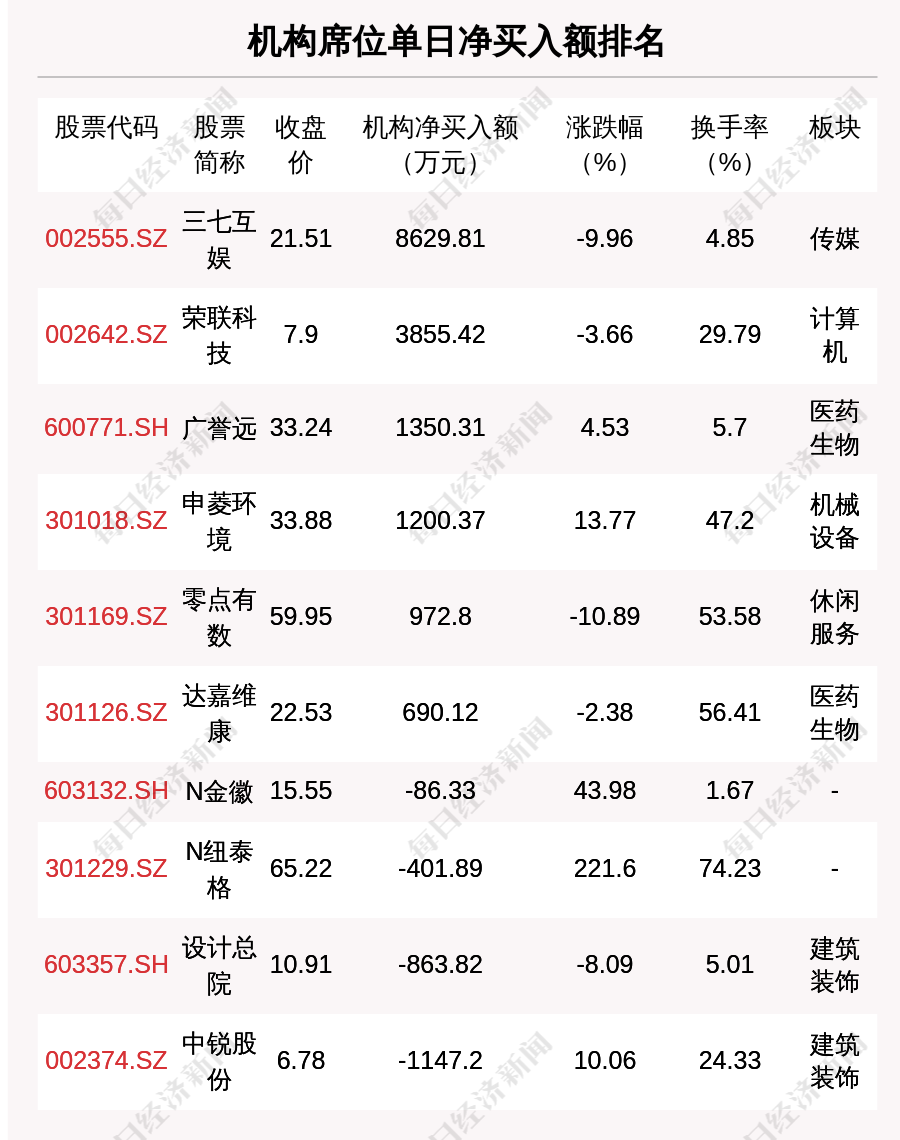 在龙虎榜中,涉及机构专用席位的个股有15只,净买入额前三的是三七互娱、荣联科技、广誉远,分别为8629.81万元、3855.42万元、1350.31万元。