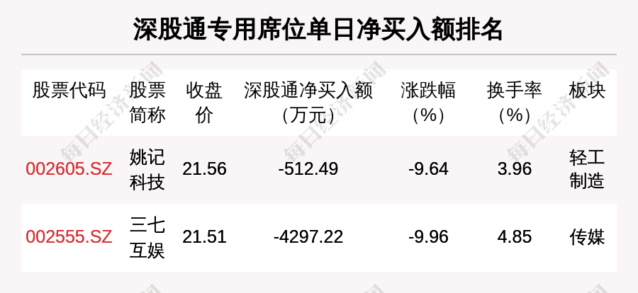 在龙虎榜中,涉及深股通专用席位的个股有2只,三七互娱的深股通专用席位净卖出额最大,净卖出4297.22万元。