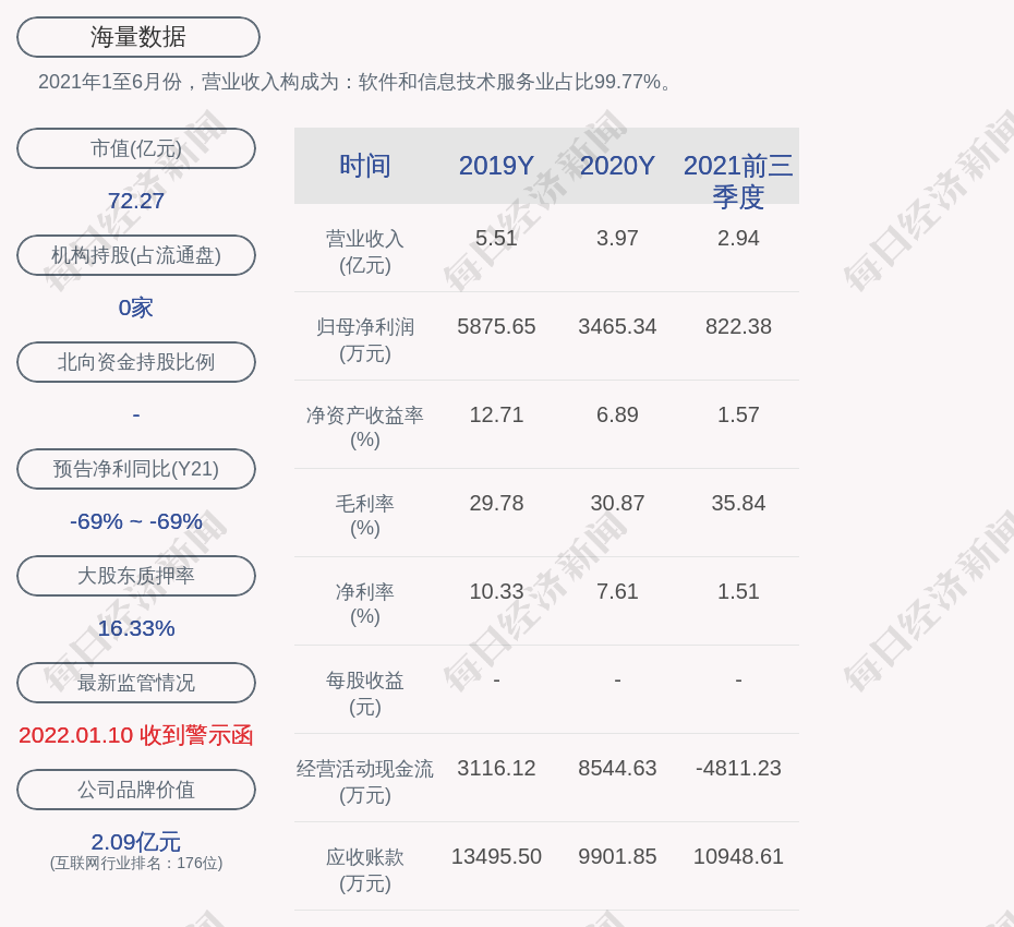 2021年1至6月份,海量数据的营业收入构成为:软件和信息技术服务业占比99.77%。