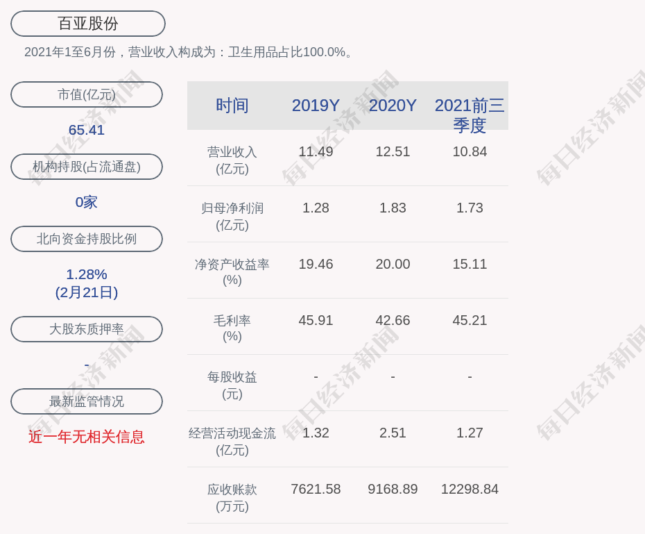 2021年1至6月份,百亚股份的营业收入构成为:卫生用品占比100.0%。