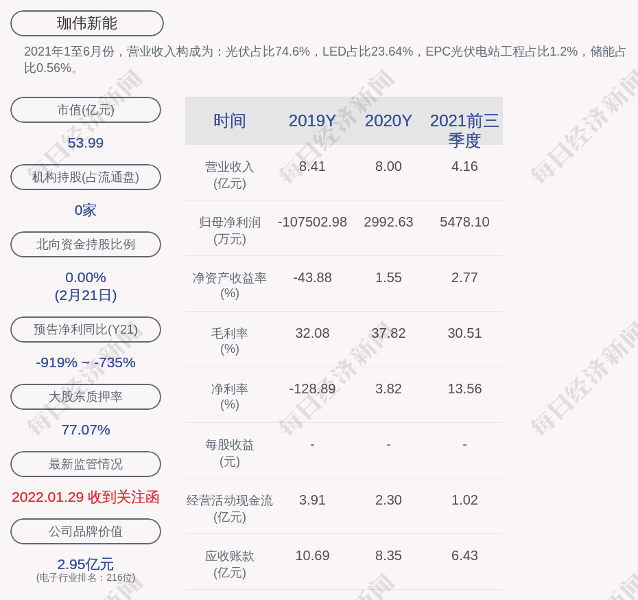 2021年1至6月份,珈伟新能的营业收入构成为:光伏占比74.6%,LED占比23.64%,EPC光伏电站工程占比1.2%,储能占比0.56%。