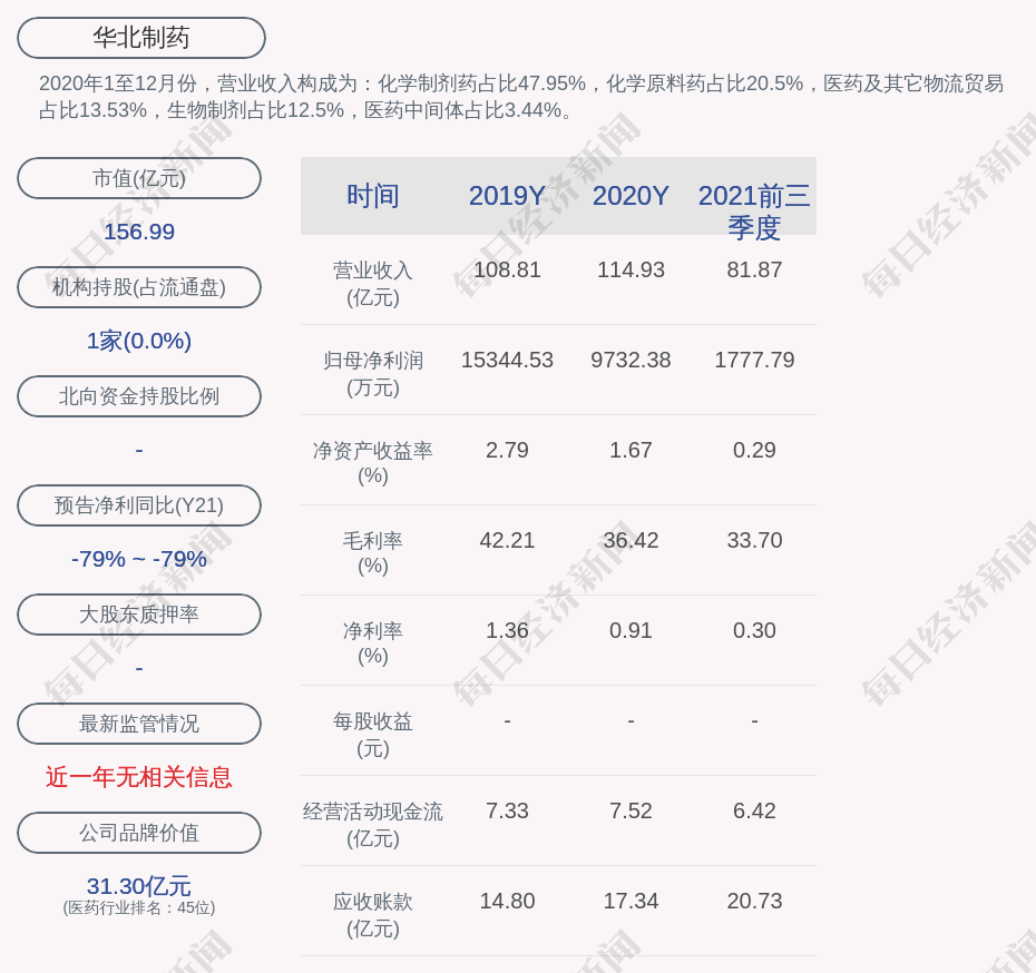 2020年1至12月份,华北制药的营业收入构成为:化学制剂药占比47.95%,化学原料药占比20.5%,医药及其它物流贸易占比13.53%,生物制剂占比12.5%,医药中间体占比3.44%。