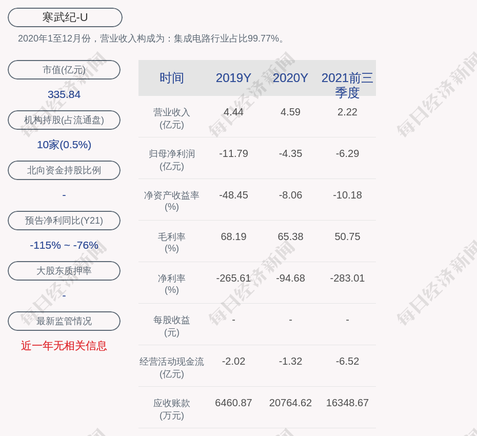 2020年1至12月份,寒武纪的营业收入构成为:集成电路行业占比99.77%。