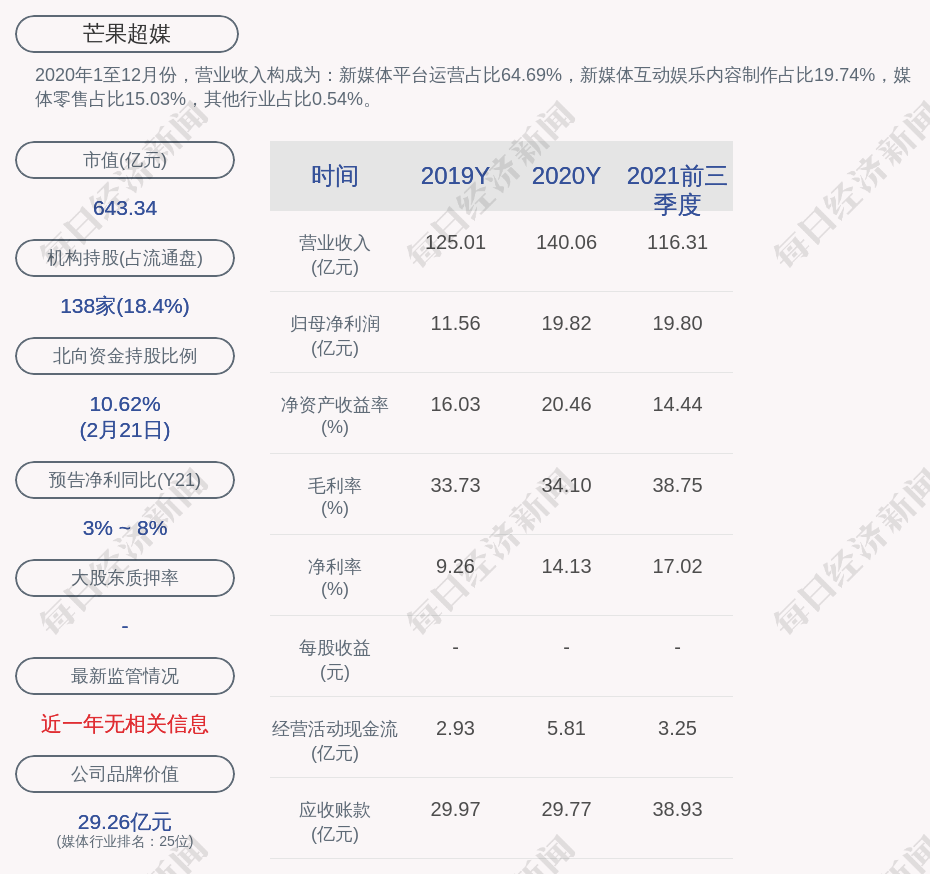 2020年1至12月份,芒果超媒的营业收入构成为:新媒体平台运营占比64.69%,新媒体互动娱乐内容制作占比19.74%,媒体零售占比15.03%,其他行业占比0.54%。