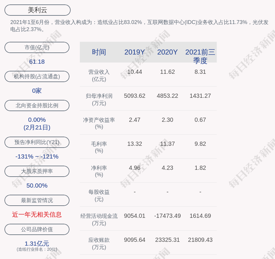 2021年1至6月份,美利云的营业收入构成为:造纸业占比83.02%,互联网数据中心(IDC)业务收入占比11.73%,光伏发电占比2.37%。