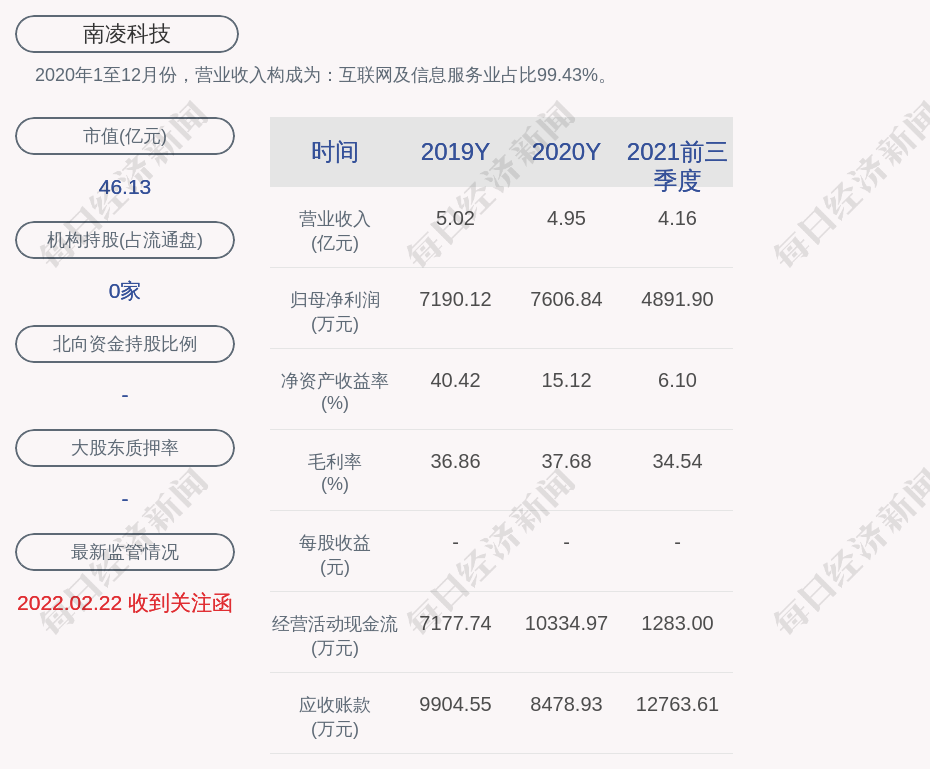 2020年1至12月份,南凌科技的营业收入构成为:互联网及信息服务业占比99.43%。