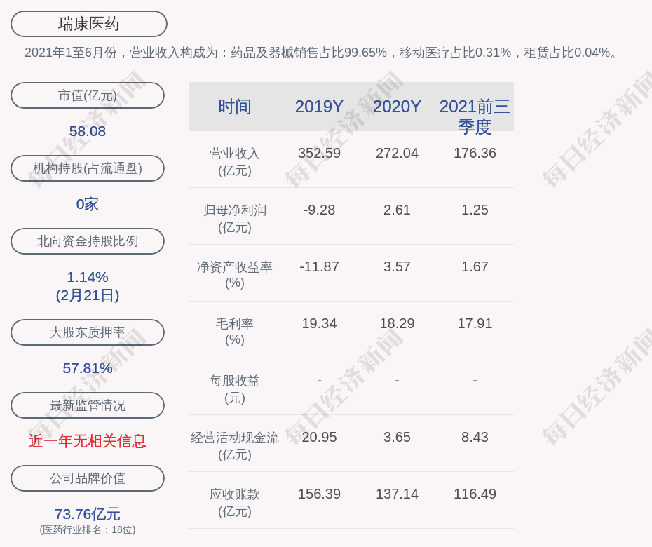 2021年1至6月份,瑞康医药的营业收入构成为:药品及器械销售占比99.65%,移动医疗占比0.31%,租赁占比0.04%。