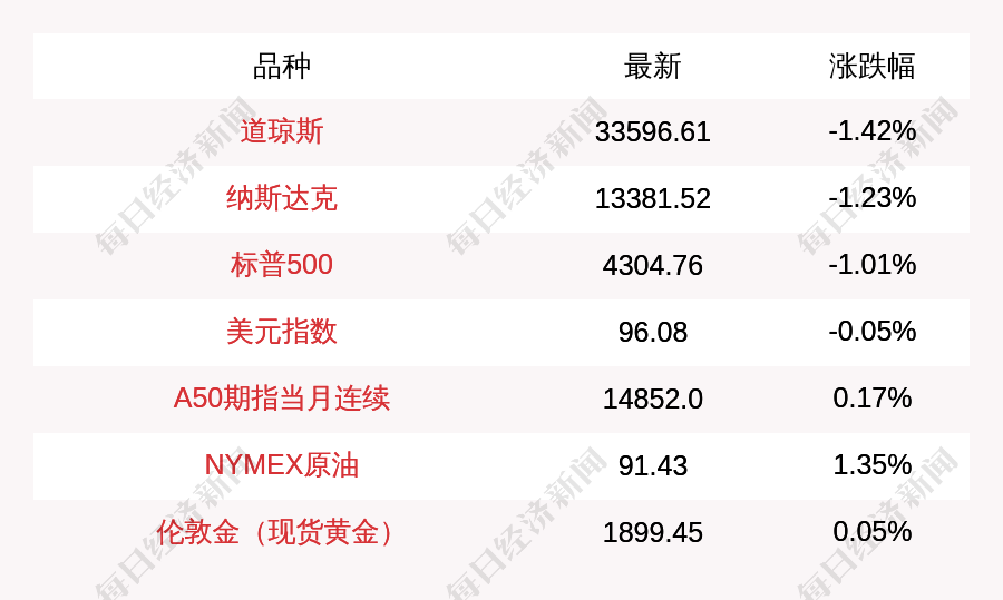 每经AI快讯:北京时间2月23日05:00,道琼斯收盘下跌482.57点,跌幅为1.42%,报33596.61点;纳斯达克收盘下跌166.55点,跌幅为1.23%,报13381.52点;标普500收盘下跌44.11点,跌幅为1.01%,报4304.76点;富时中国A50指数期货上涨25.0点,涨幅为0.17%,报14852.0点;NYMEX原油收盘上涨1.22点,涨幅为1.35%,报91.43点;美元指数收盘下跌0.05点,跌幅为0.05%,报96.08点;伦敦金(现货黄金)收盘上涨1.02点,涨幅为0.05%,报1899.45点。