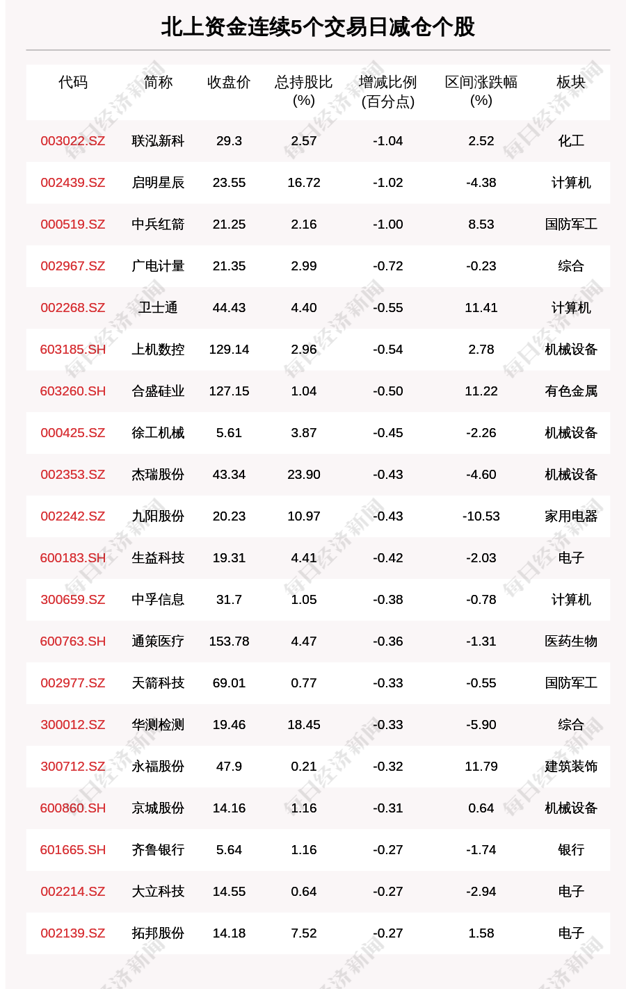 每经AI快讯,2月22日,北上资金连续5个交易日卖出54个股。北上资金连续5个交易日减仓个股中,联泓新科(003022.SZ,收盘价:29.3元)减持比例增幅最大,5个交易日减持1.04百分点,其他跌幅较大的个股包括启明星辰(002439.SZ,收盘价:23.55元)、中兵红箭(000519.SZ,收盘价:21.25元)、广电计量(002967.SZ,收盘价:21.35元),分别减持1.02个百分点、1.00个百分点、0.72个百分点。