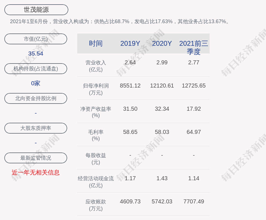 2021年1至6月份,世茂能源的营业收入构成为:供热占比68.7%,发电占比17.63%,其他业务占比13.67%。