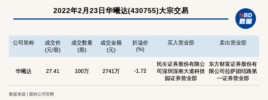 每经讯,2022年2月23日,新三板创新层公司华曦达(430755)发生一笔大宗交易,成交价27.41元/股,成交数量100万股,成交金额2741万元,折价1.72%。买入营业部是民生证券股份有限公司深圳深南大道科技园证券营业部,卖出营业部是东方财富证券股份有限公司拉萨团结路第一证券营业部。