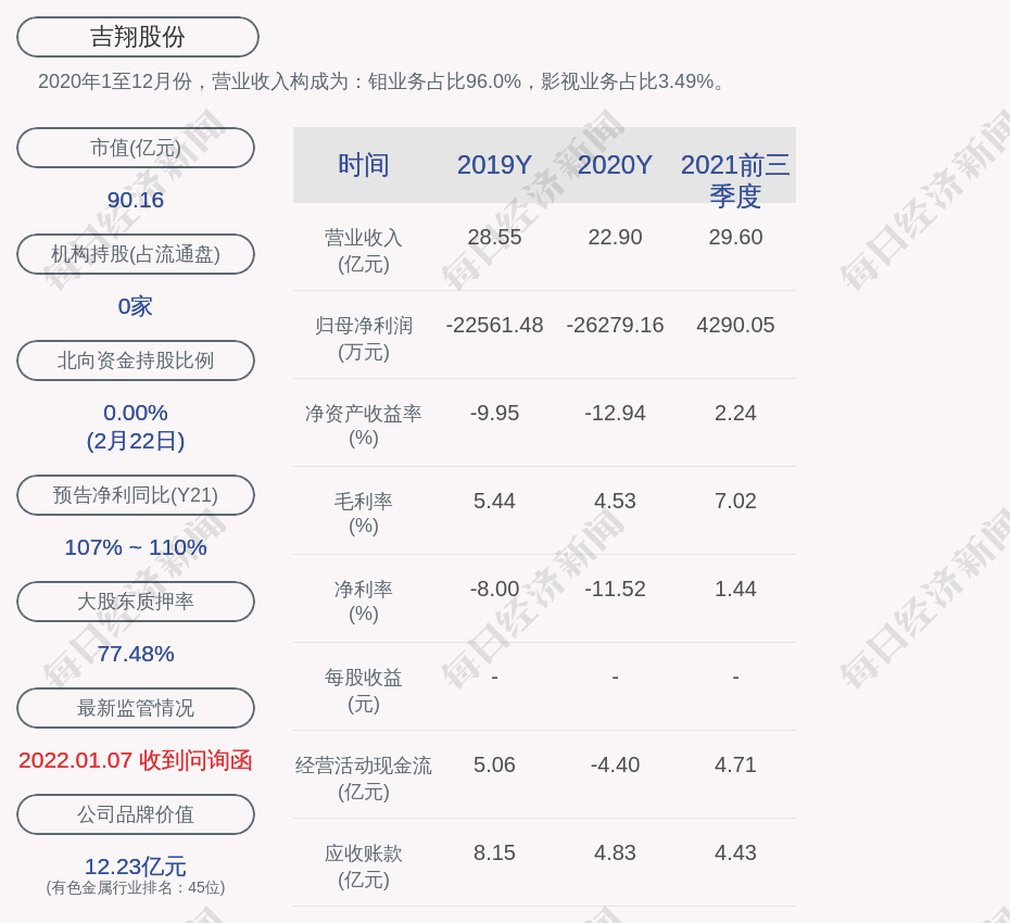 每经AI快讯,吉翔股份(SH 603399,收盘价:17.73元)2月23日晚间发布公告称,锦州吉翔钼业股份有限公司股票于2022年2月21日、22日、23日连续三个交易日内日收盘价格涨幅偏离值累计超过20%。经公司自查和向公司控股股东、实际控制人核实,截至本次公告日,公司和控股股东、实际控制人不存在应披露而未披露的信息。经核实,经向公司经营层询问、向控股股东和公司实际控制人征询,不存在关于本公司的应披露而未披露的重大信息,包括但不限于重大资产重组、发行股份、上市公司收购、债务重组、业务重组、资产注入等重大事项。
