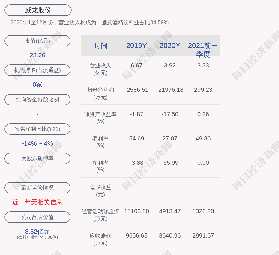 2020年1至12月份,威龙股份的营业收入构成为:酒及酒精饮料业占比84.59%。