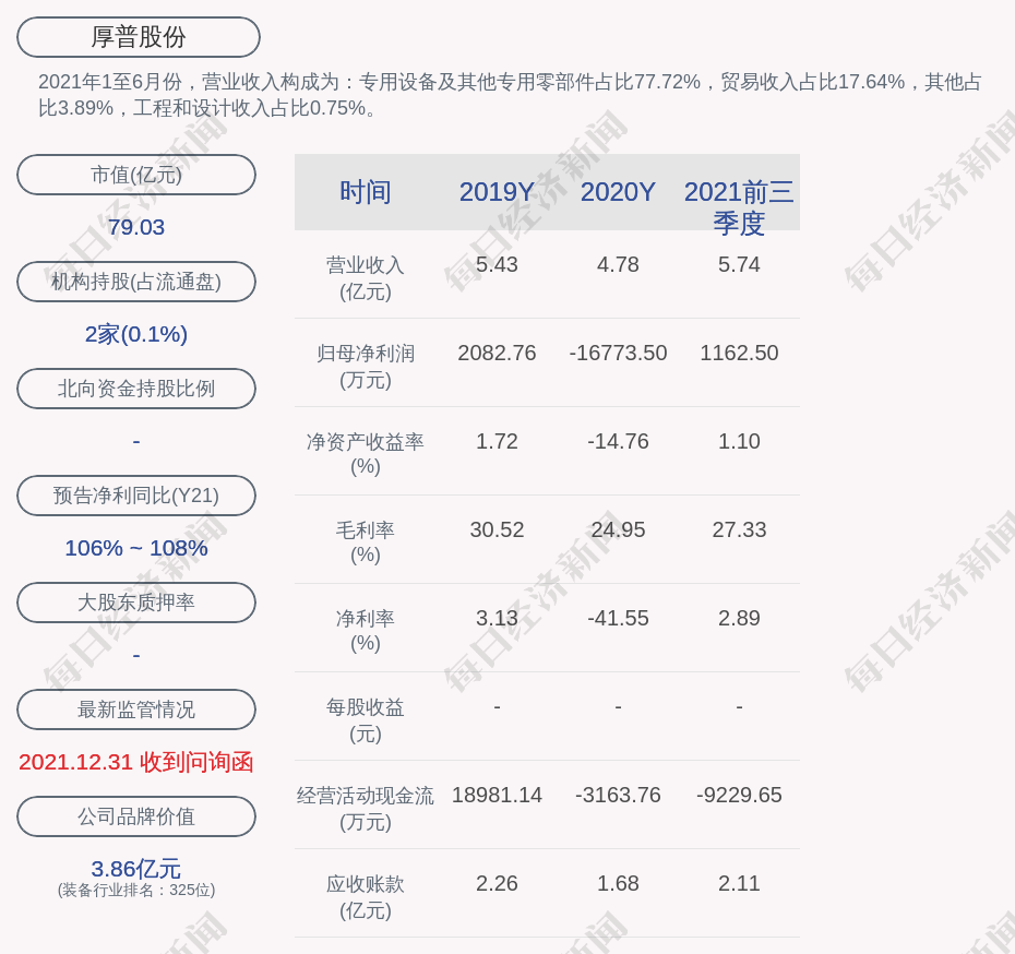 2021年1至6月份,厚普股份的营业收入构成为:专用设备及其他专用零部件占比77.72%,贸易收入占比17.64%,其他占比3.89%,工程和设计收入占比0.75%。