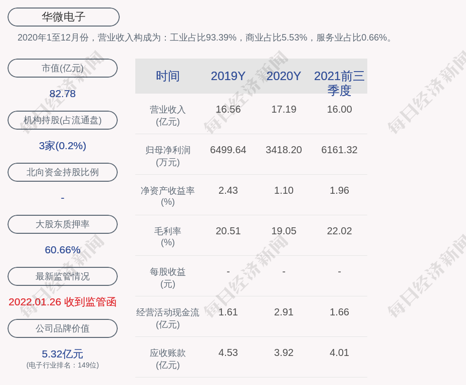 2020年1至12月份,华微电子的营业收入构成为:工业占比93.39%,商业占比5.53%,服务业占比0.66%。