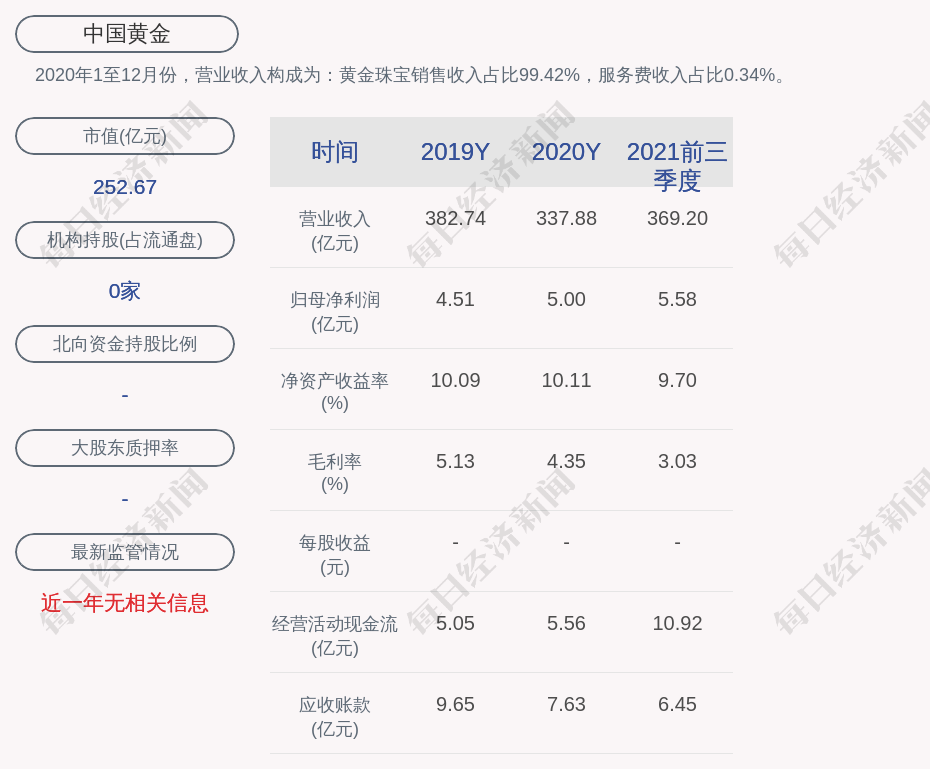 2020年1至12月份,中国黄金的营业收入构成为:黄金珠宝销售收入占比99.42%,服务费收入占比0.34%。
