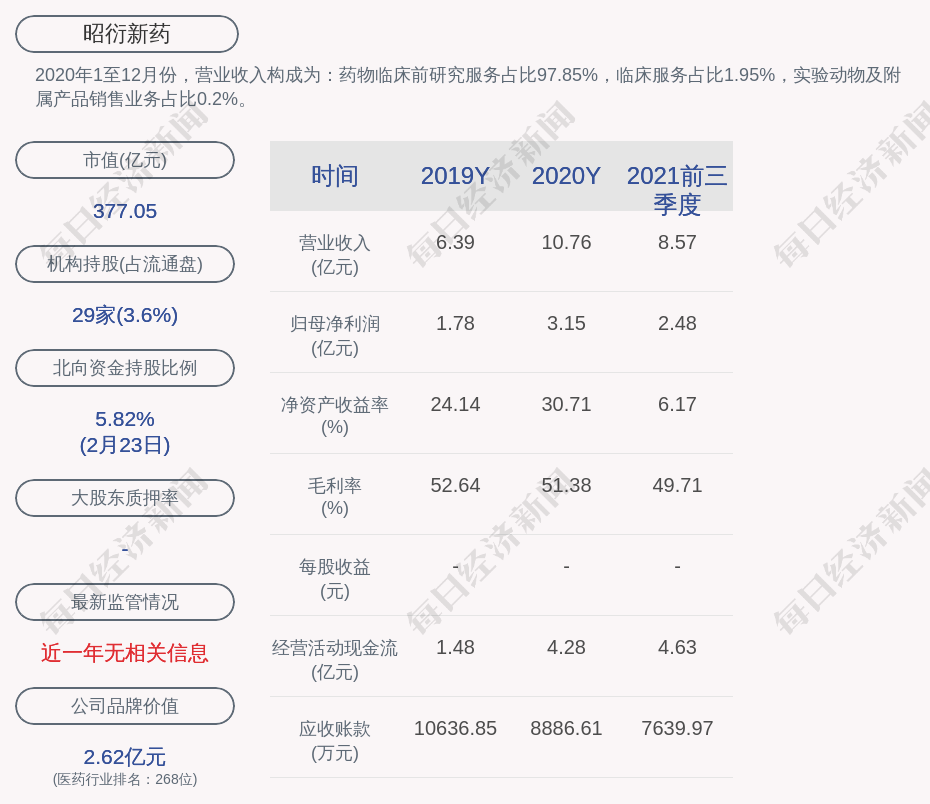 每经AI快讯,昭衍新药(SH 603127,收盘价:108.41元)2月24日晚间发布2021年年度业绩快报,营业收入15.17亿元,同比增加40.99%;归属于上市公司股东的净利润5.57亿元,同比增加76.83%;基本每股收益1.51元,同比增加51%。