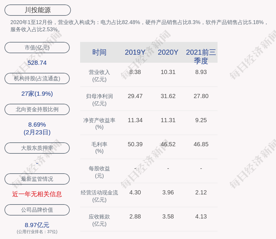 2020年1至12月份,川投能源的营业收入构成为:电力占比82.48%,硬件产品销售占比8.3%,软件产品销售占比5.18%,服务收入占比2.53%。