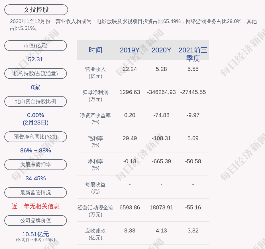 2020年1至12月份,文投控股的营业收入构成为:电影放映及影视项目投资占比65.49%,网络游戏业务占比29.0%,其他占比5.51%。