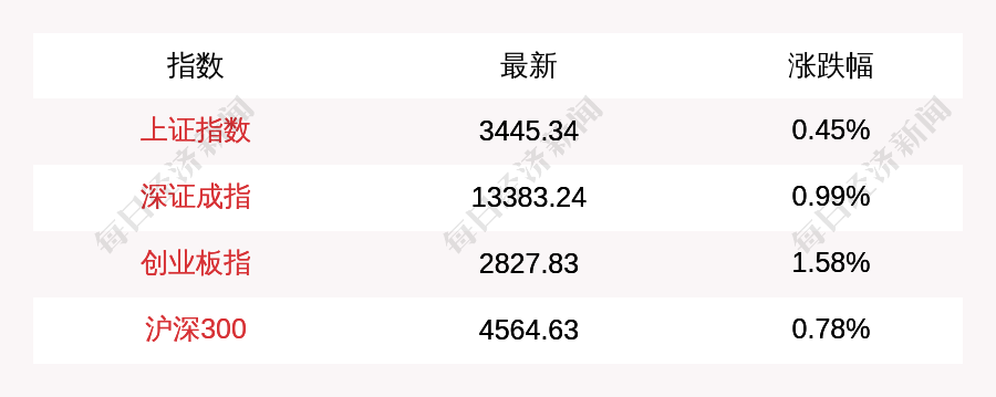每经AI快讯:北京时间2月25日9:30,上证指数开盘上涨15.38点,涨幅为0.45%,报3445.34点;深证成指开盘上涨131.0点,涨幅为0.99%,报13383.24点;创业板指开盘上涨43.93点,涨幅为1.58%,报2827.83点;沪深300开盘上涨35.31点,涨幅为0.78%,报4564.63点。