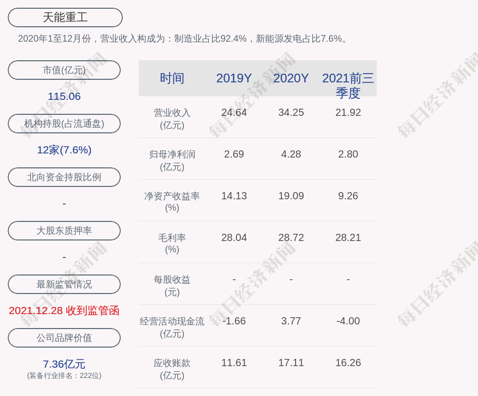 2020年1至12月份,天能重工的营业收入构成为:制造业占比92.4%,新能源发电占比7.6%。