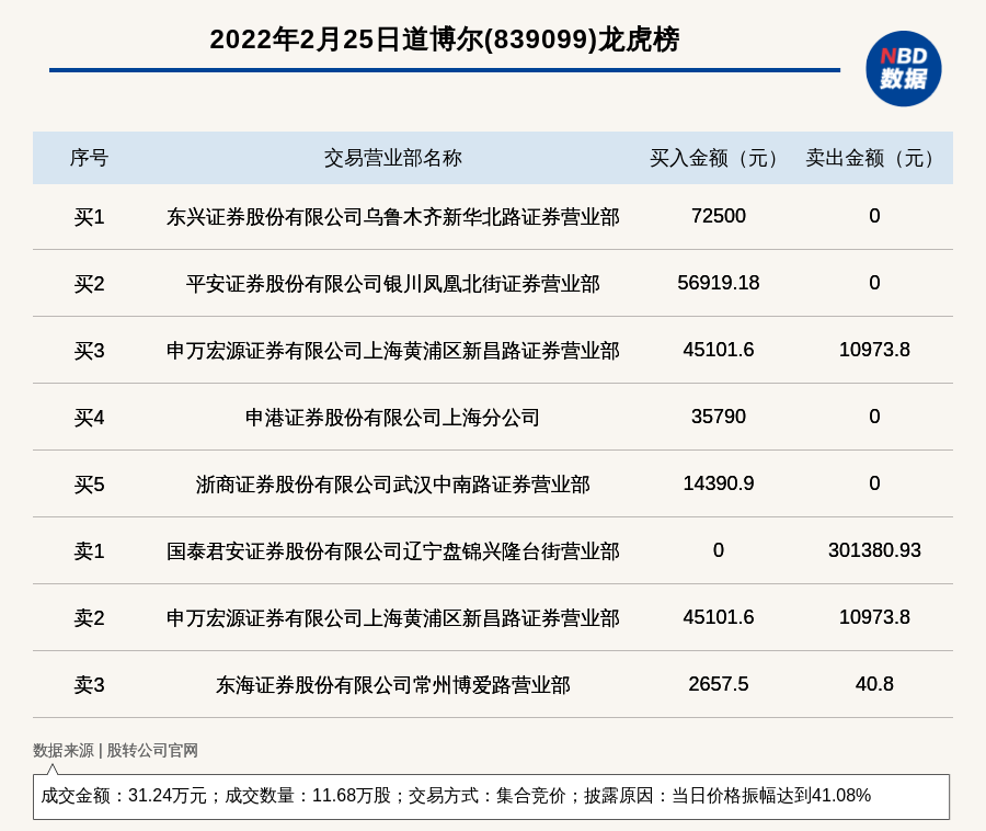 每经讯,2022年2月25日,新三板创新层公司道博尔(839099)登上龙虎榜,交易方式是集合竞价,披露原因是当日价格振幅达到41.08%,成交数量11.68万股,成交金额31.24万元。买一席位为东兴证券股份有限公司乌鲁木齐新华北路证券营业部,买入7.25万元;卖一席位为国泰君安证券股份有限公司辽宁盘锦兴隆台街营业部,卖出30.14万元。