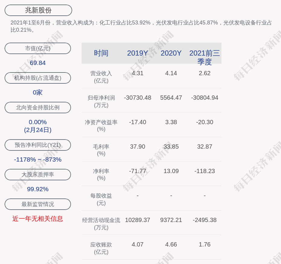 2021年1至6月份,兆新股份的营业收入构成为:化工行业占比53.92%,光伏发电行业占比45.87%,光伏发电设备行业占比0.21%。
