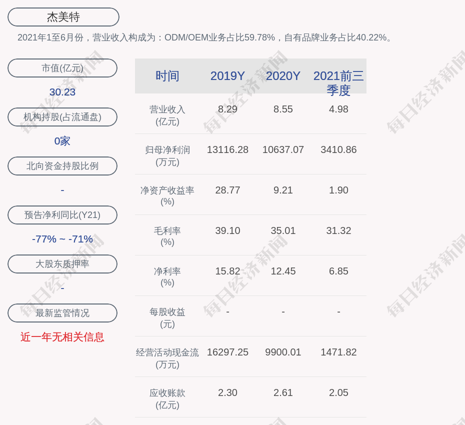 2021年1至6月份,杰美特的营业收入构成为:ODM/OEM业务占比59.78%,自有品牌业务占比40.22%。