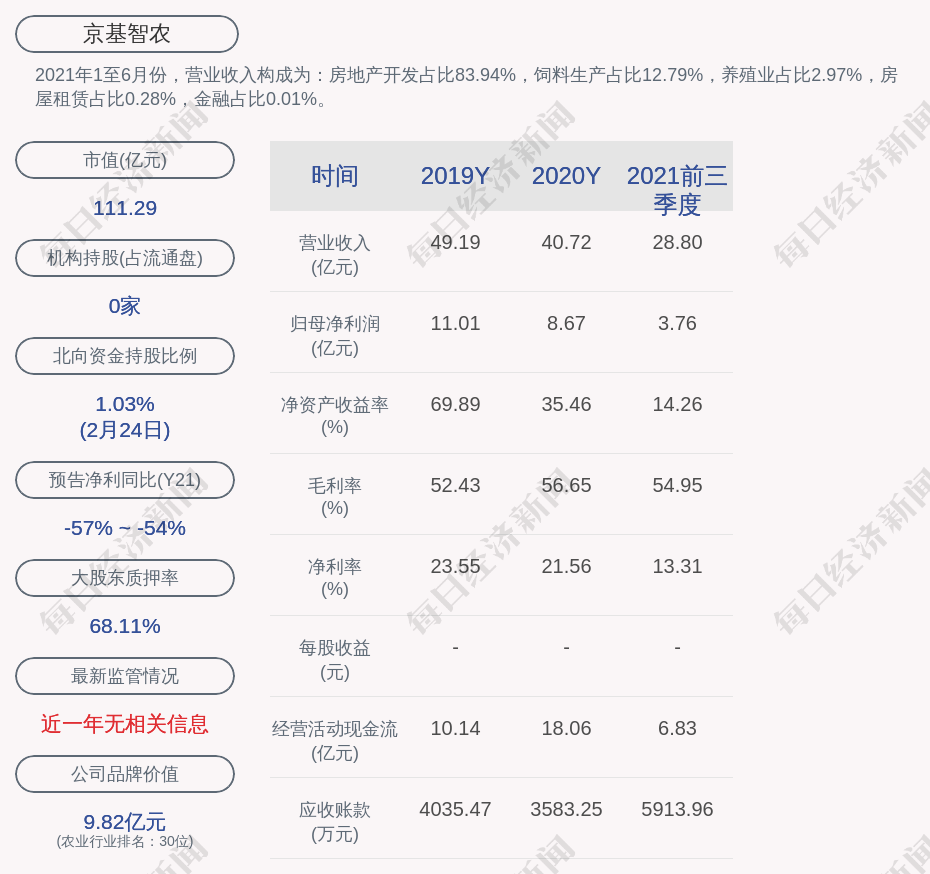 2021年1至6月份,京基智农的营业收入构成为:房地产开发占比83.94%,饲料生产占比12.79%,养殖业占比2.97%,房屋租赁占比0.28%,金融占比0.01%。
