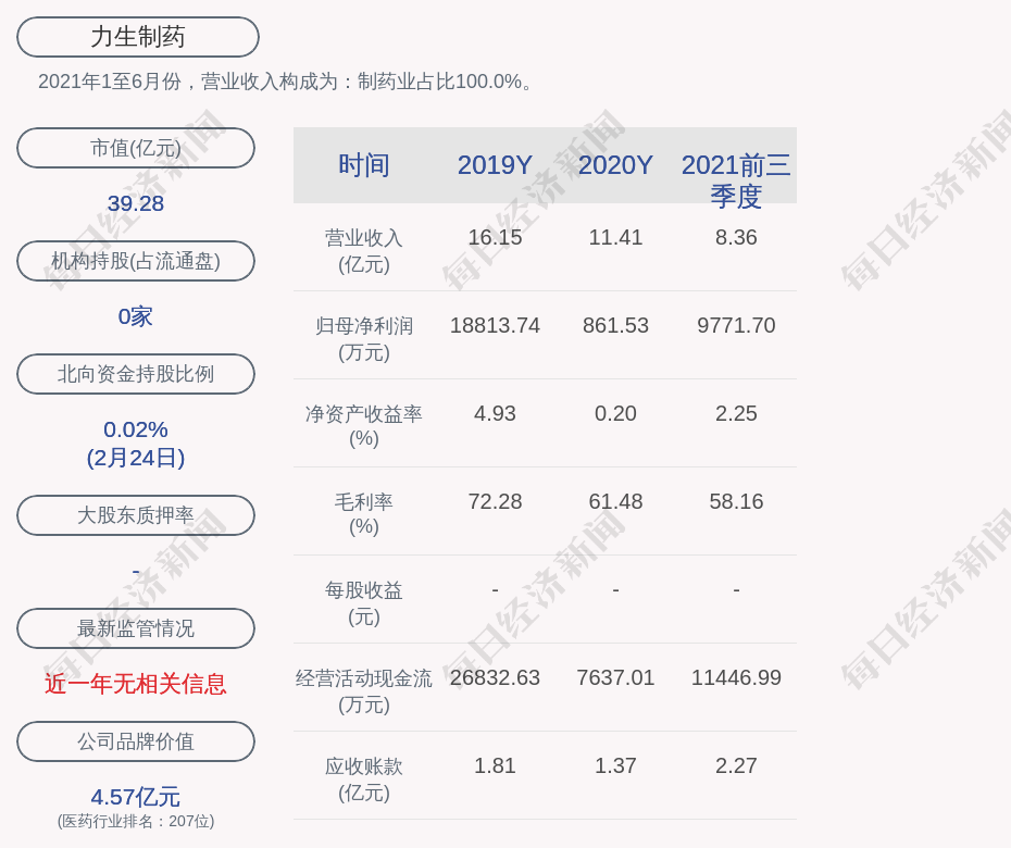 2021年1至6月份,力生制药的营业收入构成为:制药业占比100.0%。