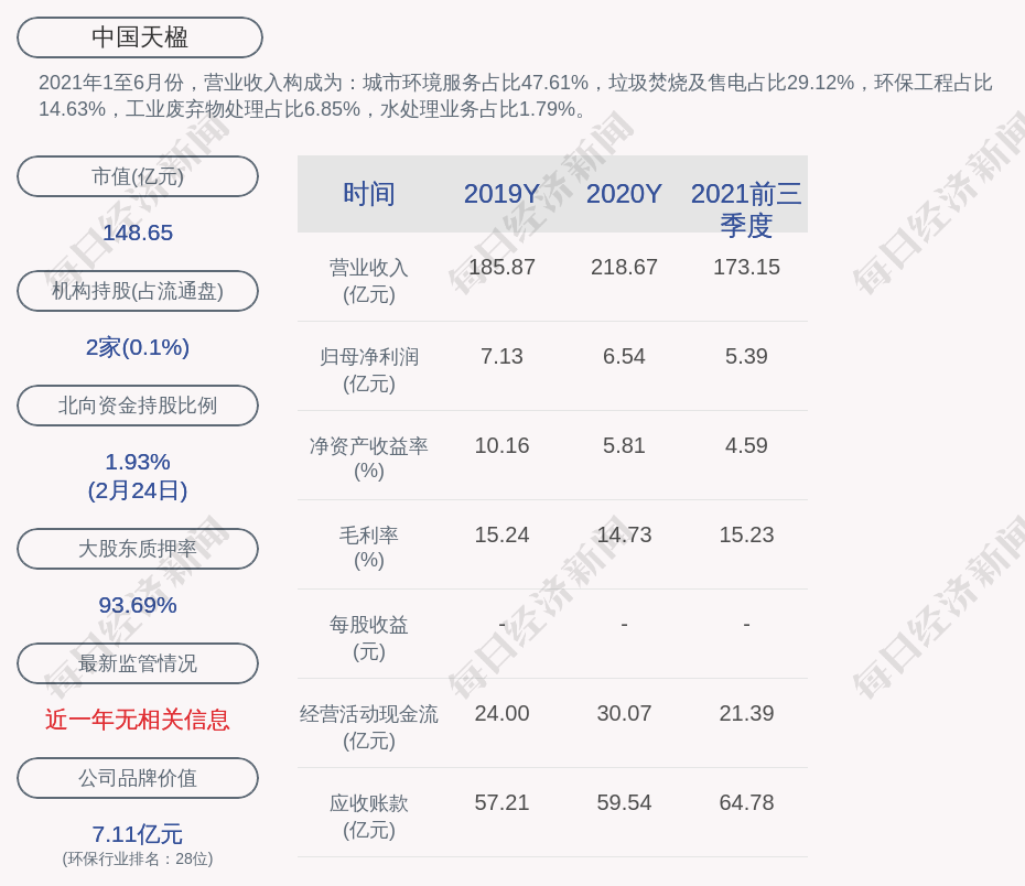 2021年1至6月份,中国天楹的营业收入构成为:城市环境服务占比47.61%,垃圾焚烧及售电占比29.12%,环保工程占比14.63%,工业废弃物处理占比6.85%,水处理业务占比1.79%。