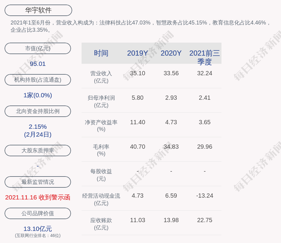 2021年1至6月份,华宇软件的营业收入构成为:法律科技占比47.03%,智慧政务占比45.15%,教育信息化占比4.46%,企业占比3.35%。