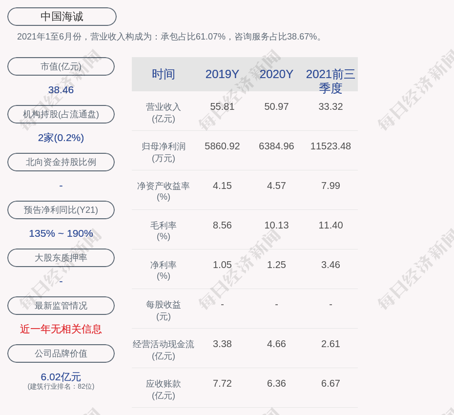 2021年1至6月份,中国海诚的营业收入构成为:承包占比61.07%,咨询服务占比38.67%。