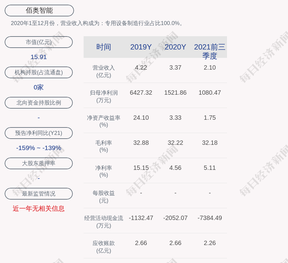 2020年1至12月份,佰奥智能的营业收入构成为:专用设备制造行业占比100.0%。