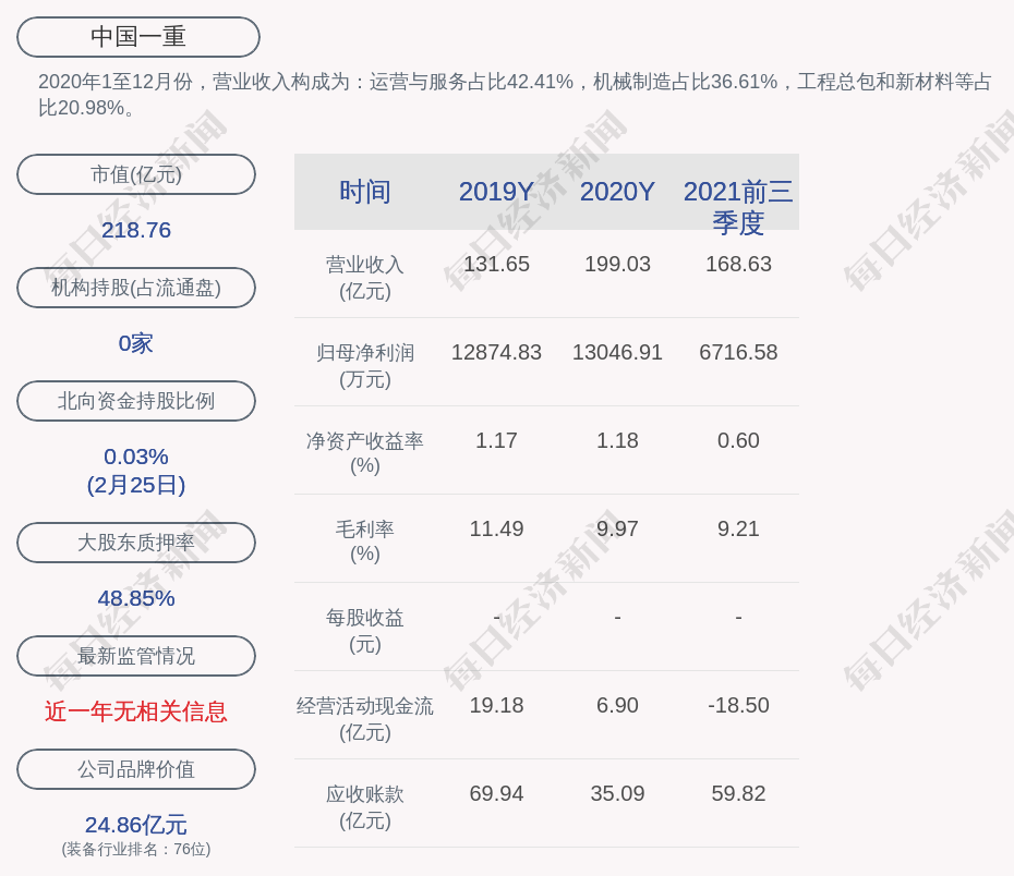 2020年1至12月份,中国一重的营业收入构成为:运营与服务占比42.41%,机械制造占比36.61%,工程总包和新材料等占比20.98%。