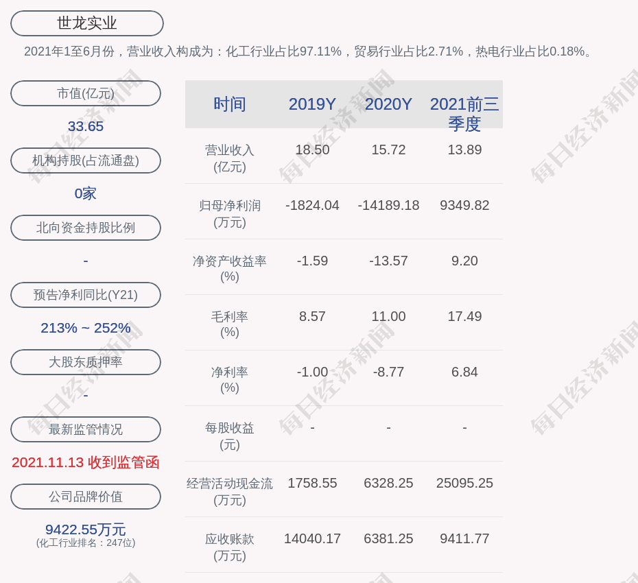 2021年1至6月份,世龙实业的营业收入构成为:化工行业占比97.11%,贸易行业占比2.71%,热电行业占比0.18%。