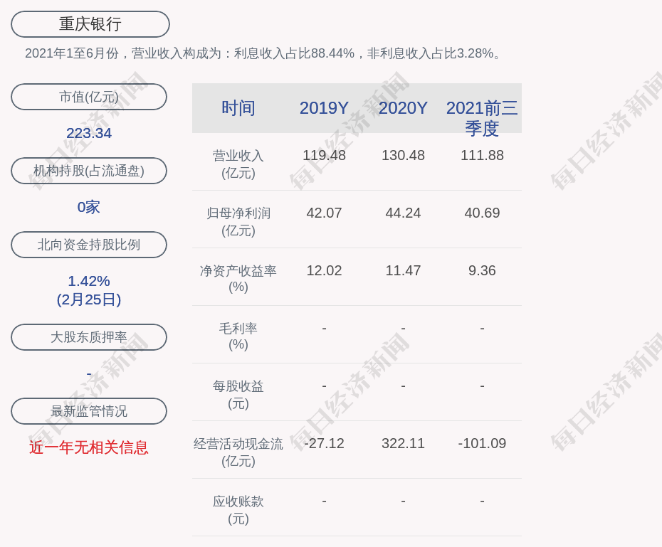 2021年1至6月份,重庆银行的营业收入构成为:利息收入占比88.44%,非利息收入占比3.28%。