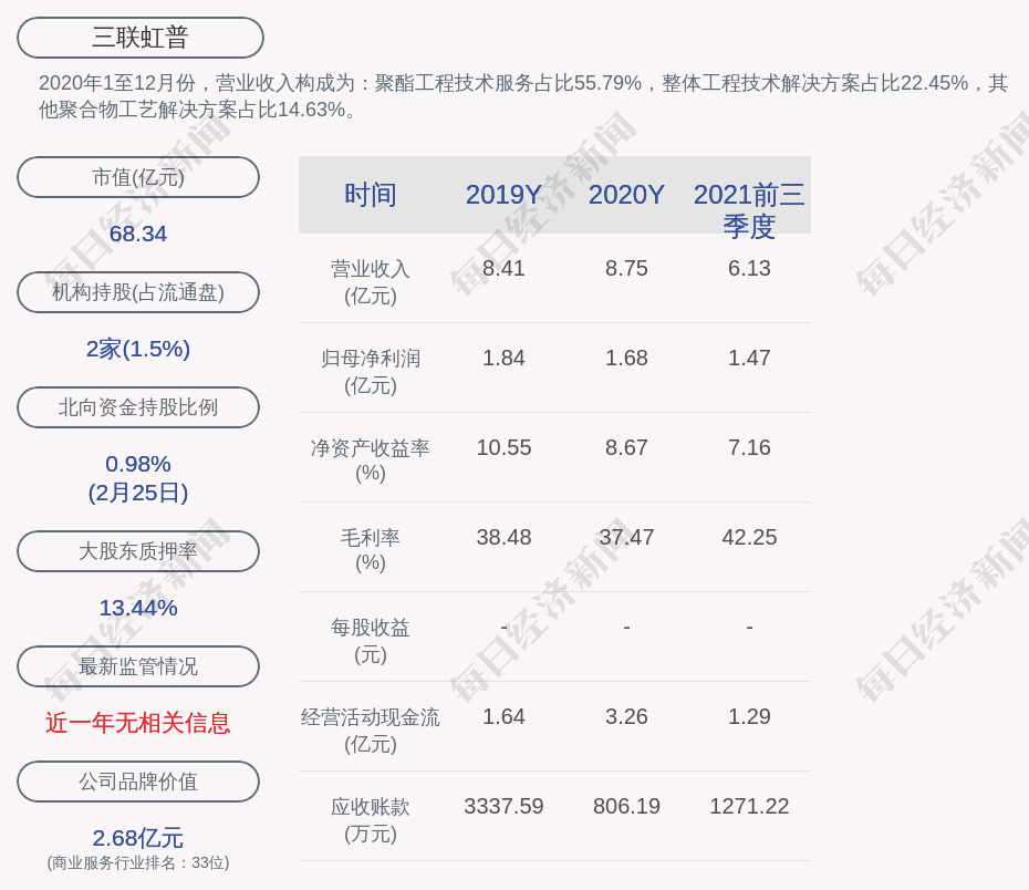 2020年1至12月份,三联虹普的营业收入构成为:聚酯工程技术服务占比55.79%,整体工程技术解决方案占比22.45%,其他聚合物工艺解决方案占比14.63%。