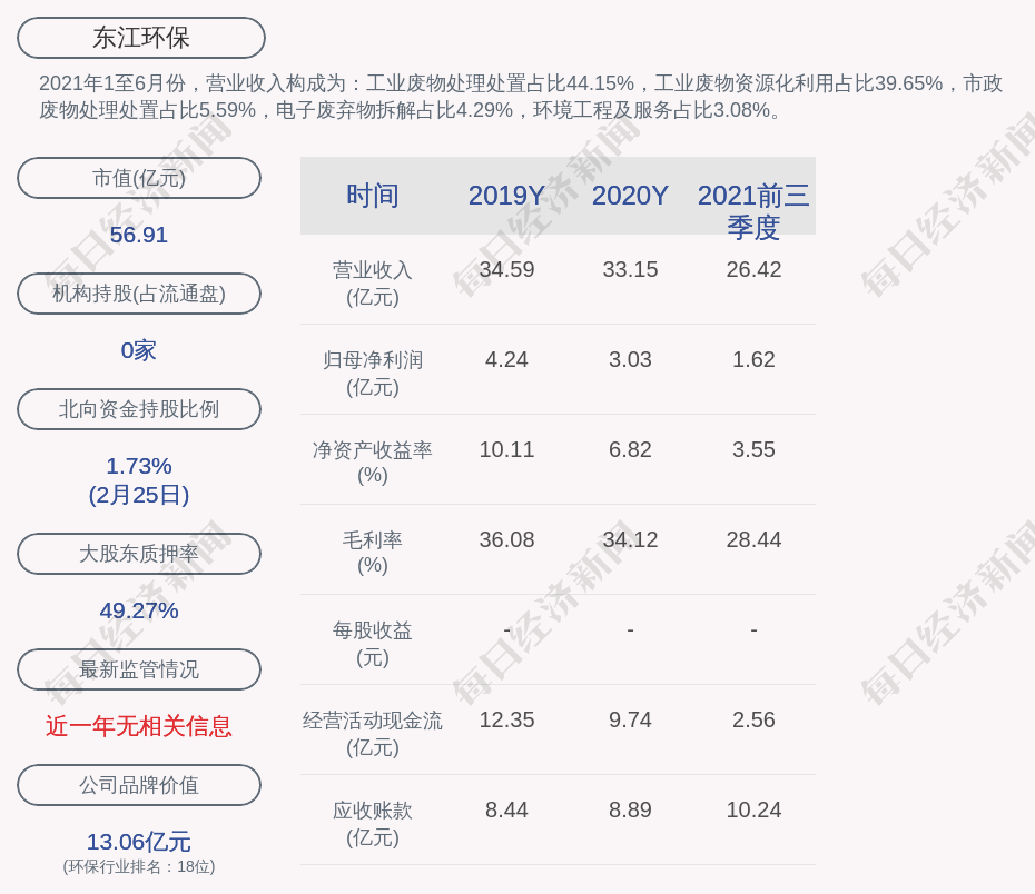 2021年1至6月份,东江环保的营业收入构成为:工业废物处理处置占比44.15%,工业废物资源化利用占比39.65%,市政废物处理处置占比5.59%,电子废弃物拆解占比4.29%,环境工程及服务占比3.08%。