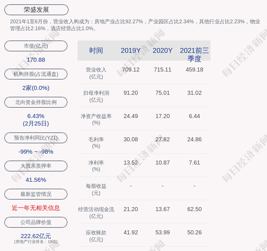 2021年1至6月份,荣盛发展的营业收入构成为:房地产业占比92.27%,产业园区占比2.34%,其他行业占比2.23%,物业管理占比2.16%,酒店经营占比1.0%。