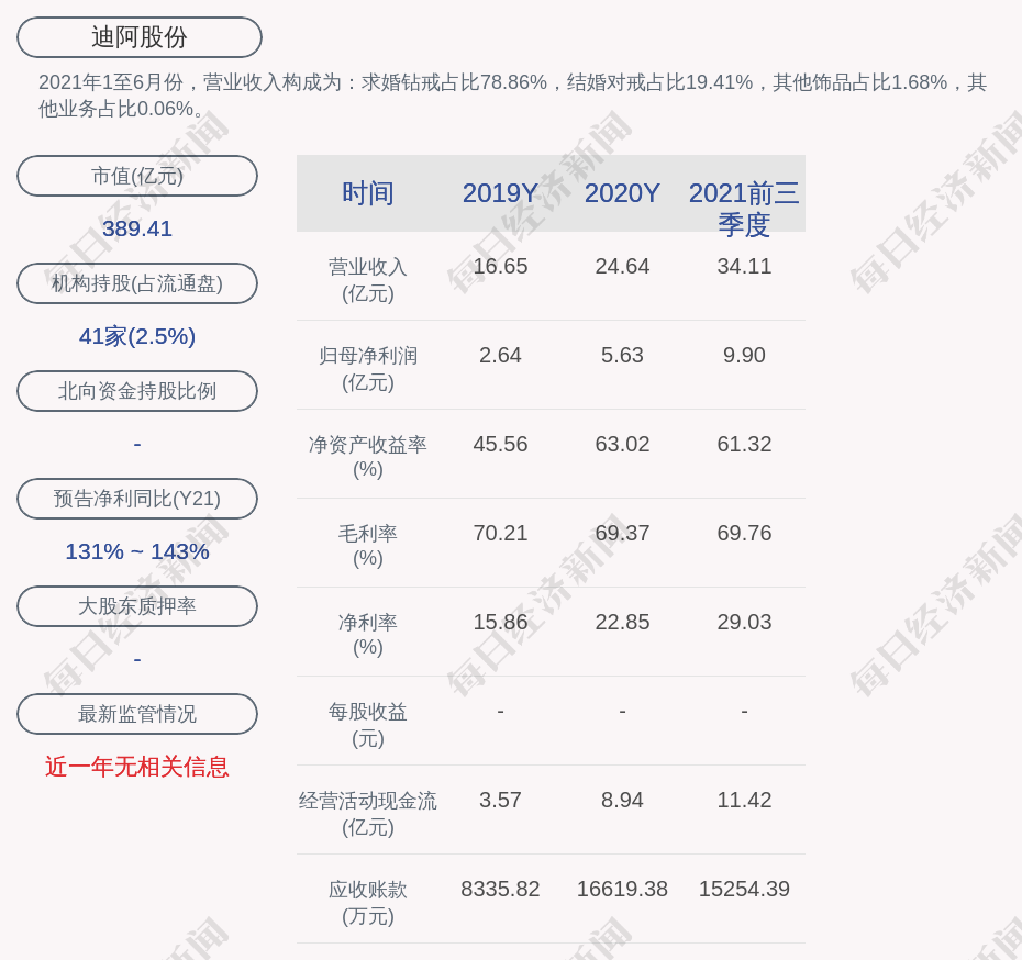 2021年1至6月份,迪阿股份的营业收入构成为:求婚钻戒占比78.86%,结婚对戒占比19.41%,其他饰品占比1.68%,其他业务占比0.06%。