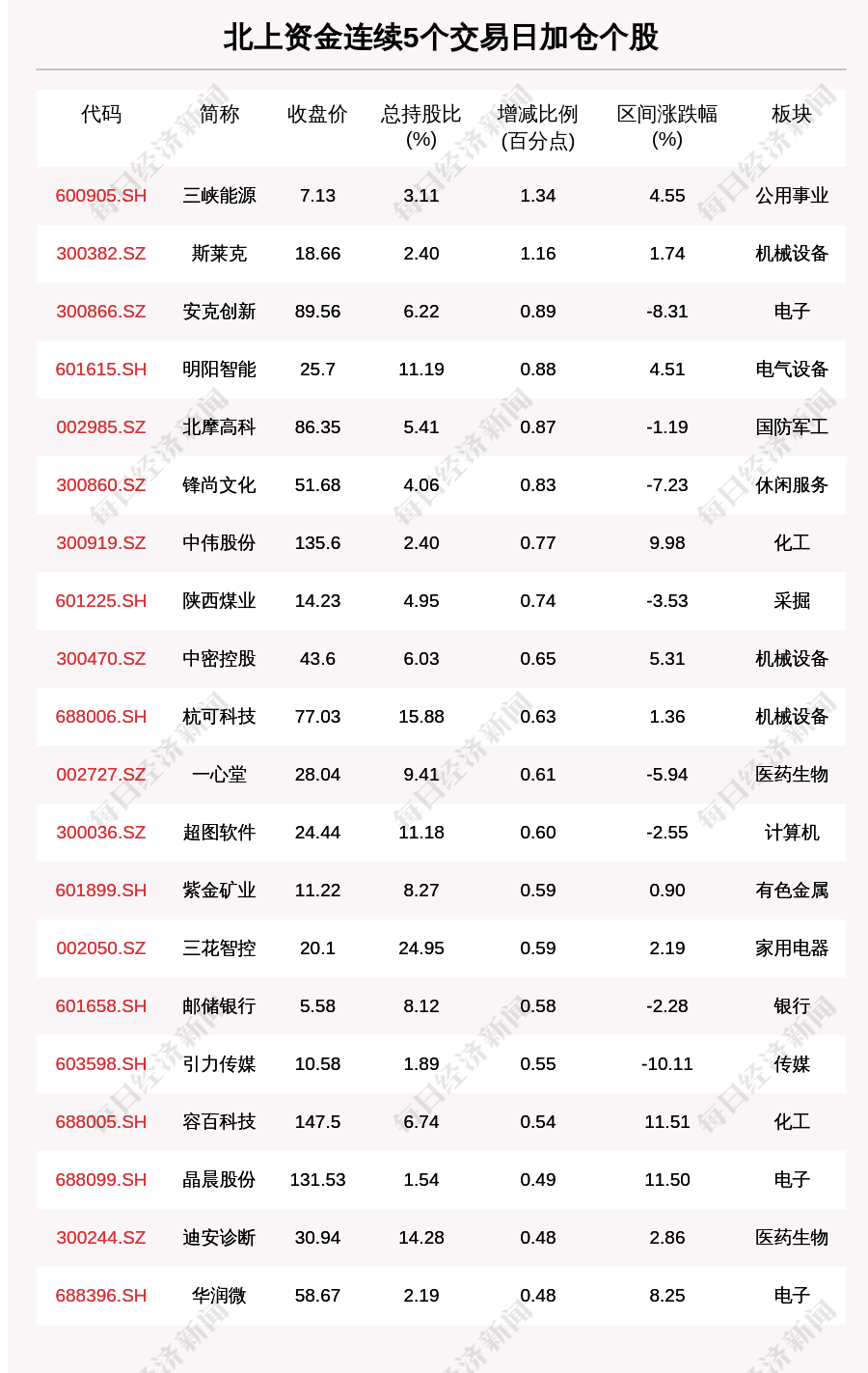 每经AI快讯,2月28日,北上资金连续5个交易日买入68个股。北上资金连续5个交易日加仓个股中,三峡能源(600905.SH,收盘价:7.13元)增持比例增幅最大,5个交易日增持1.34个百分点,其他增持比例较大的个股包括斯莱克(300382.SZ,收盘价:18.66元)、安克创新(300866.SZ,收盘价:89.56元)、明阳智能(601615.SH,收盘价:25.7元),分别增持1.16个百分点、0.89个百分点、0.88个百分点。