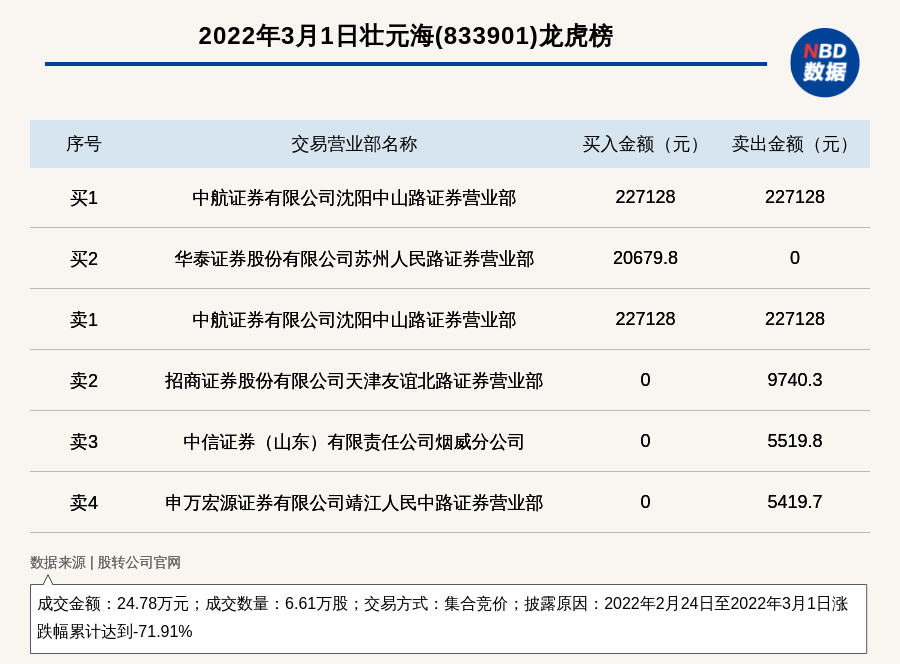每经讯,2022年3月1日,新三板基础层公司壮元海(833901)登上龙虎榜,交易方式是集合竞价,披露原因是2022年2月24日至2022年3月1日涨跌幅累计达到-71.91%,成交数量6.61万股,成交金额24.78万元。买一席位为中航证券有限公司沈阳中山路证券营业部,买入22.71万元;卖一席位为中航证券有限公司沈阳中山路证券营业部,卖出22.71万元。
