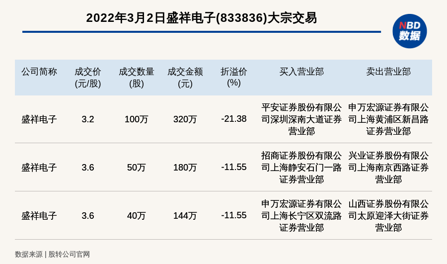 每经讯,2022年3月2日,新三板基础层公司盛祥电子(833836)发生3笔大宗交易,总成交金额为644万元,成交金额最高的一笔成交价3.2元/股,成交数量100万股,成交金额320万元,折价21.38%。买入营业部是平安证券股份有限公司深圳深南大道证券营业部,卖出营业部是申万宏源证券有限公司上海黄浦区新昌路证券营业部。